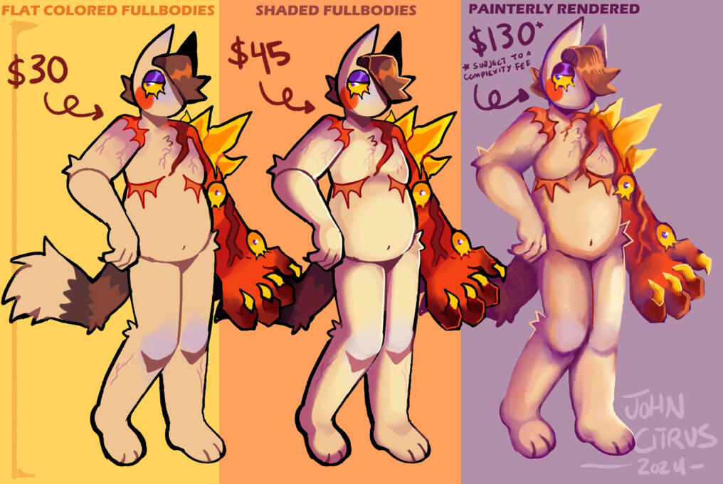 $30.00 USD for a flat colored fullbody, $45.00 USD for a fully shaded fullbody, and $130.00 USD for a painterly rendered fullbody. Subject to a fee for complexity. Too complex and I may deny service. Want a background? Ask for a quote, prices will vary. Don't be afraid to ask for more examples.